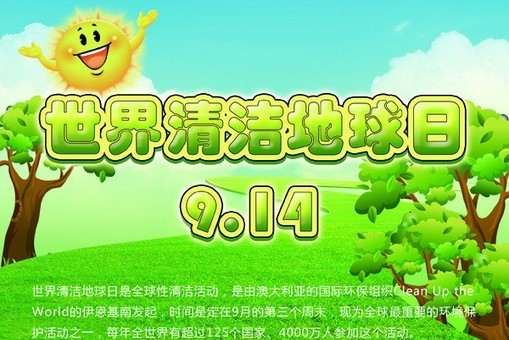 世界清潔地球日又名世界清潔日,英文為Clean Up the World Weekend (CUW Weekend),是全球性清潔活動,是由澳大利亞的國際環(huán)保組織Clean Up the World的伊恩基南發(fā)起,時間是定在9月的第三個周末,現為全球非常重要的環(huán)境保護活動之一,每年全世界有超過125個國家、4000萬人參加這個活動。2006年的世界清潔日活動時間為9月15日至17日3天。也有參與組織和個人把每年的9月14日作為活動時間。