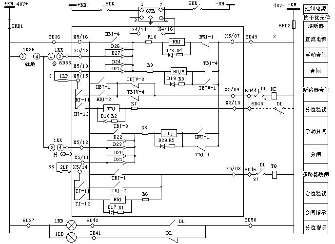 +KM → X5/16 → TBJ-1(TBJ-2)→ X5/08 → TQ線圈 → -KM,從而啟動斷路器跳閘線圈TQ,實現了手動跳閘。