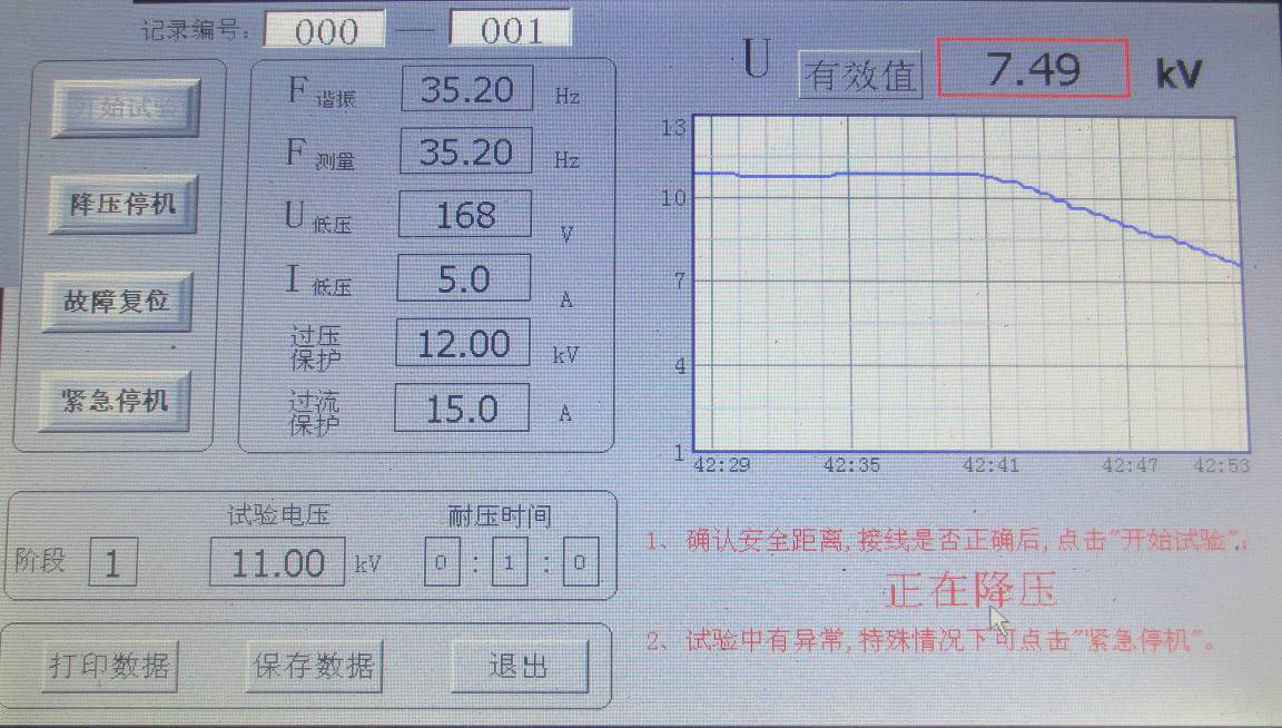 當時間到設置時的耐壓時間時,系統自動降壓,右下角提示“正在降壓,如有異常情況,請點擊“降壓停機””; 顯示界面如圖所示。