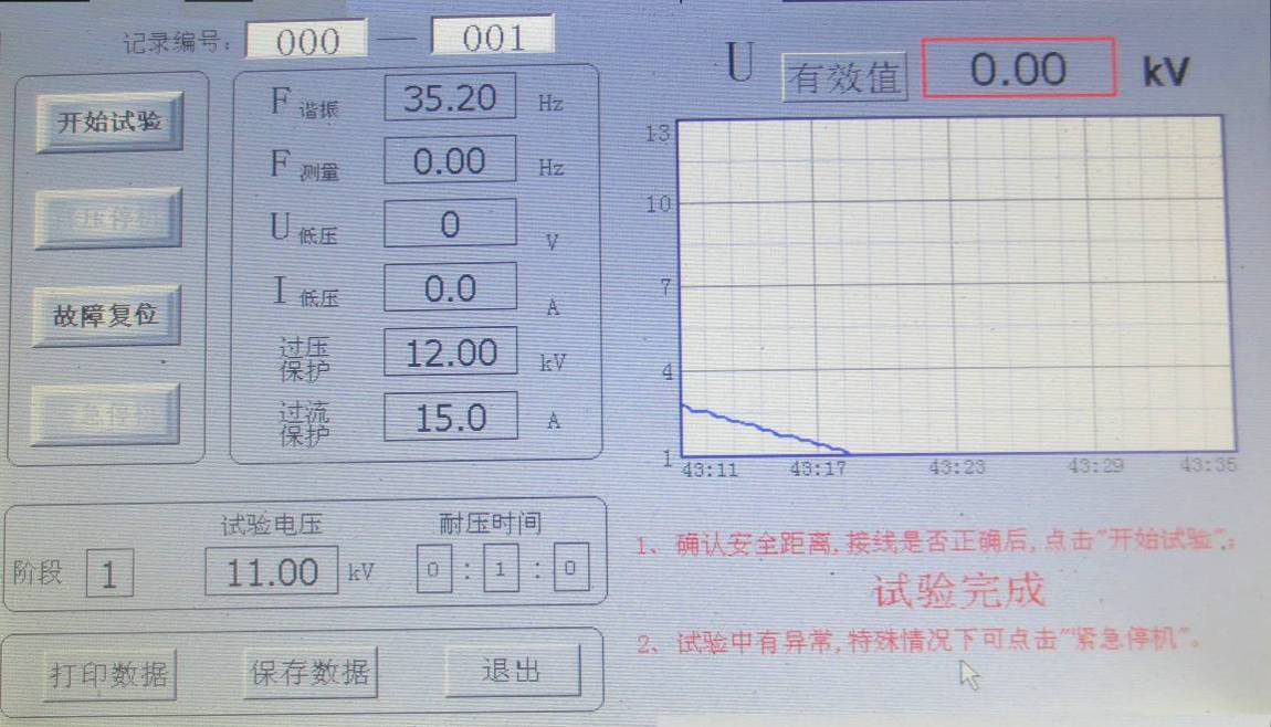 當U諧振電壓降壓0時,右下角提示“試驗完成”, 顯示界面如圖所示。