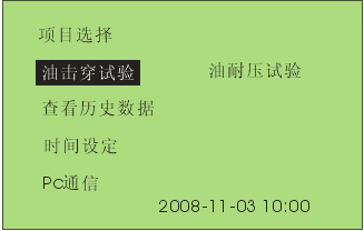 7 通過旋轉(zhuǎn)鼠標(biāo)可以選擇進行擊穿試驗,耐壓試驗,查看歷史數(shù)據(jù),時間設(shè)定和PC通信等操作項目。