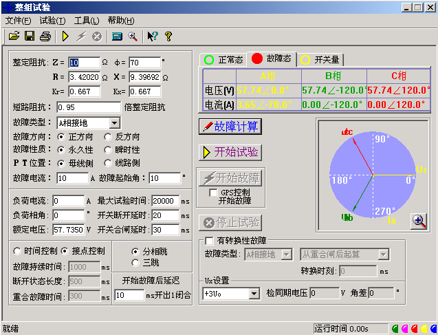 以上只設置了相應的短路阻抗,如果再告訴軟件一定的故障電流,軟件將自動計算出相應的故障電壓,由測試儀輸出相應的故障電壓和電流給保護。設置的故障電流應滿足以下要求:1、大于保護的啟動電流;2、故障電流與短路阻抗的乘積應不大于57.7V。