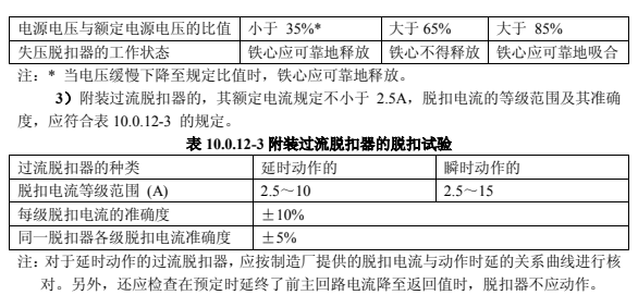 表 10.0.12-2 附裝失壓脫扣器的脫扣試驗(yàn)