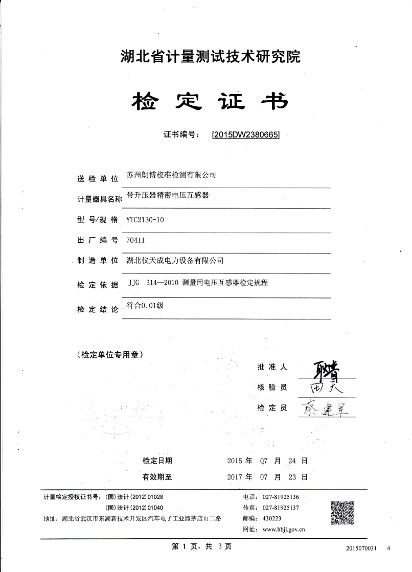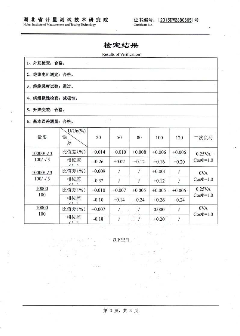 當電壓為50% Un 時,比差不大 于0.075%,角差不大于3',