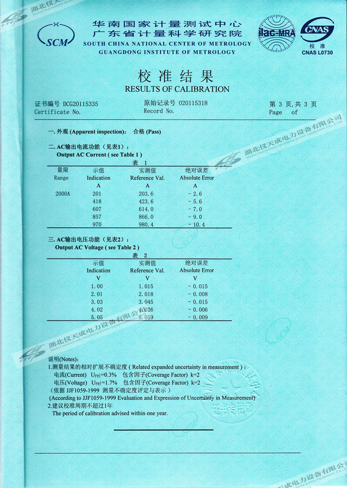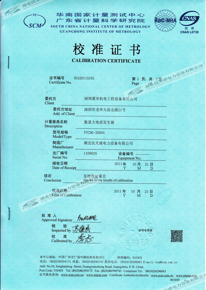 轉載:"YTCDG-2000A大電流發生器的資質證書" 請注明來源于儀天成電力。 更多技術問題請致電儀天成電力客戶服務:027-87876585,技術部專線:027-87876585,在線客服:719388481