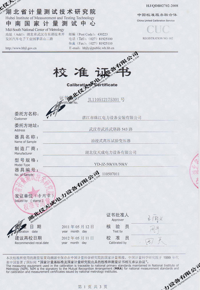轉載:"YD-JZ-50kVA/50kV油浸式試驗變壓器的資質證書" 請注明來源于儀天成電力。 更多技術問題請致電儀天成電力客戶服務:027-87876585,技術部專線:027-87876585,在線客服:719388481